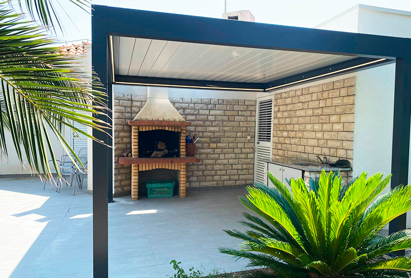Combinación de dos modelos de pérgola Moraira en la costa del mar Adriático, ampliando el espacio útil de la vivienda de cara al caluroso verano.