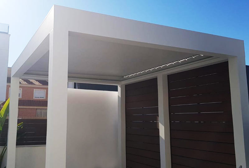 Pérgola Altea en formato isla, instalada en una terraza de un ático en Gran Alacant. Cuenta con luces led perimetrales y acabados blancos en Ral 9016txt.