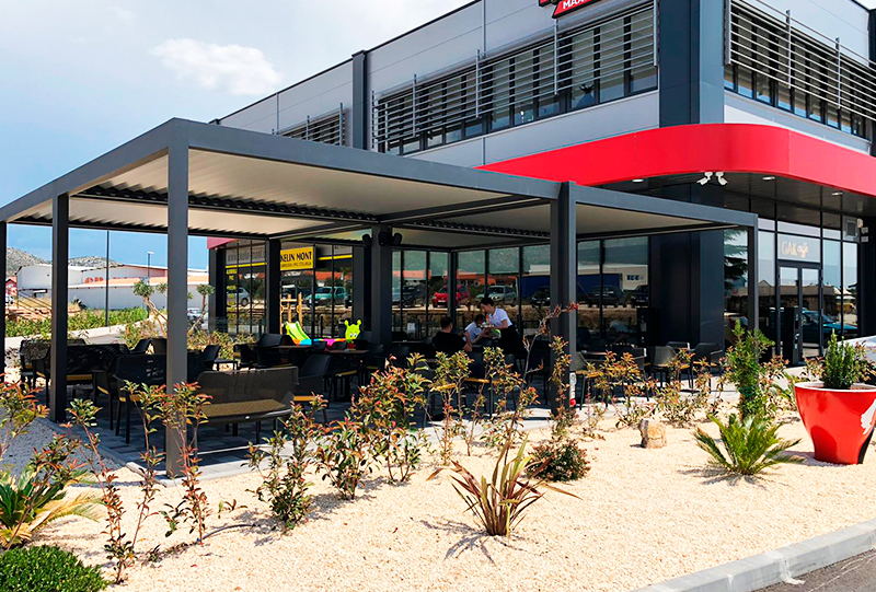 Instalación de 4 modelos de pérgola Moraira en la estación de servicio en una de las autovías en Croacia. Una manera perfecta de ampliar los espacios para el sector de la hostelería, a la vez de ofrecer protección total contra las inclemencias de tiempo.