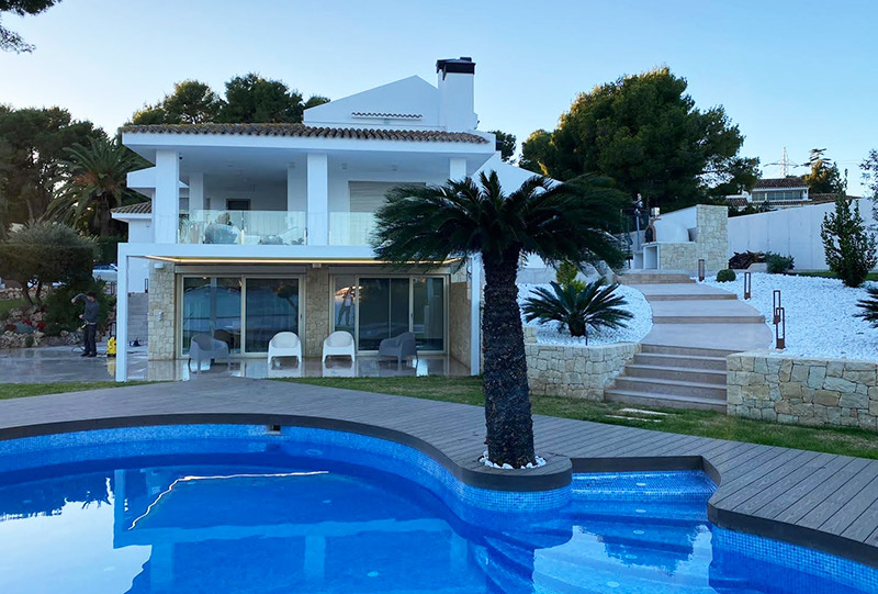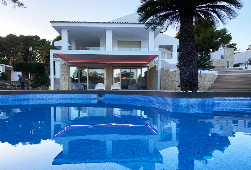 Instalación de pérgola bioclimática Altea de 7×4 m con tiras de LED RGB para regular el color de tu ambiente preferido, estructura con 2 pilares a pared y mecanismos totalmente motorizados.