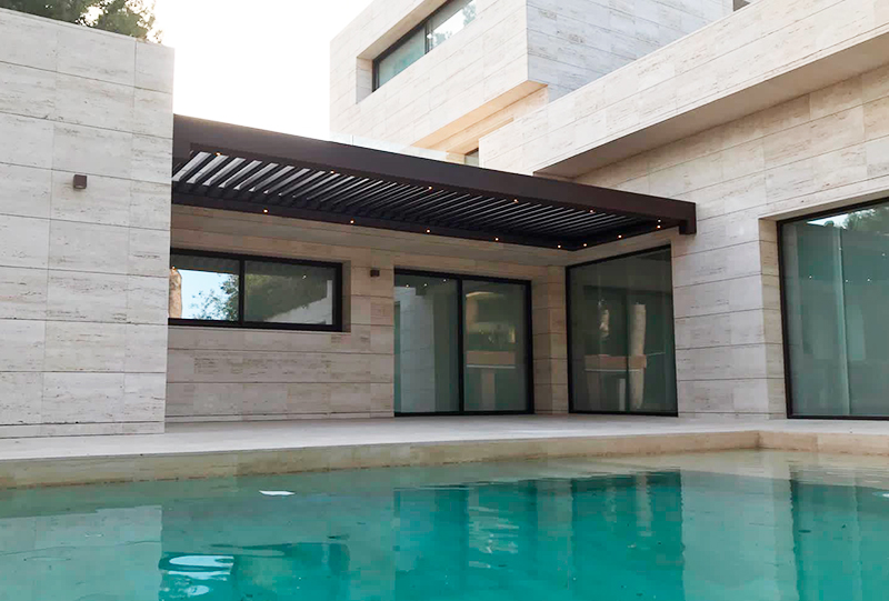 Ubicada en Monasterios (Valencia) tiene una integración perfecta entre-paredes del modelo Altea, con luces perimetrales de focos LED Régulus con la fachada de la vivienda, con la que conseguimos crear un nuevo espacio que poder utilizar durante los calurosos días de verano, incluye drenaje interior oculto en piedra de fachada porcelánica.