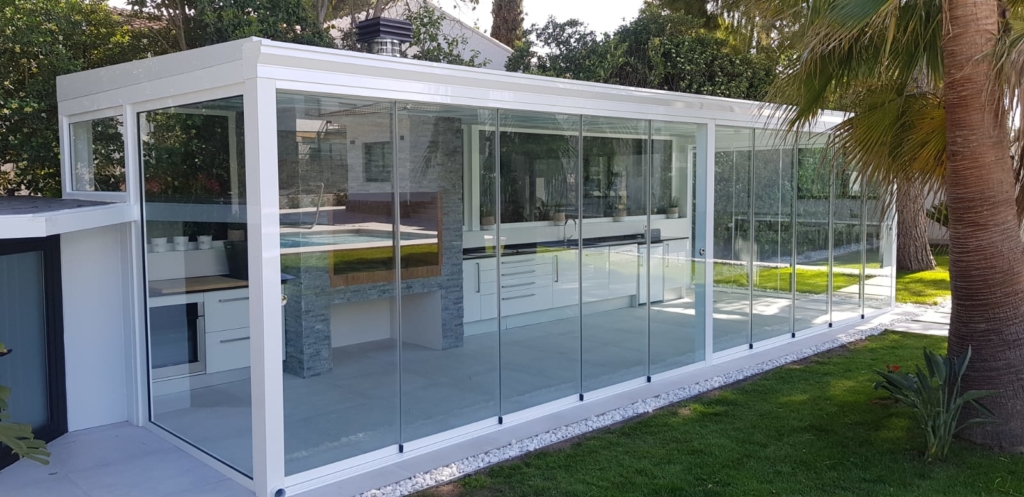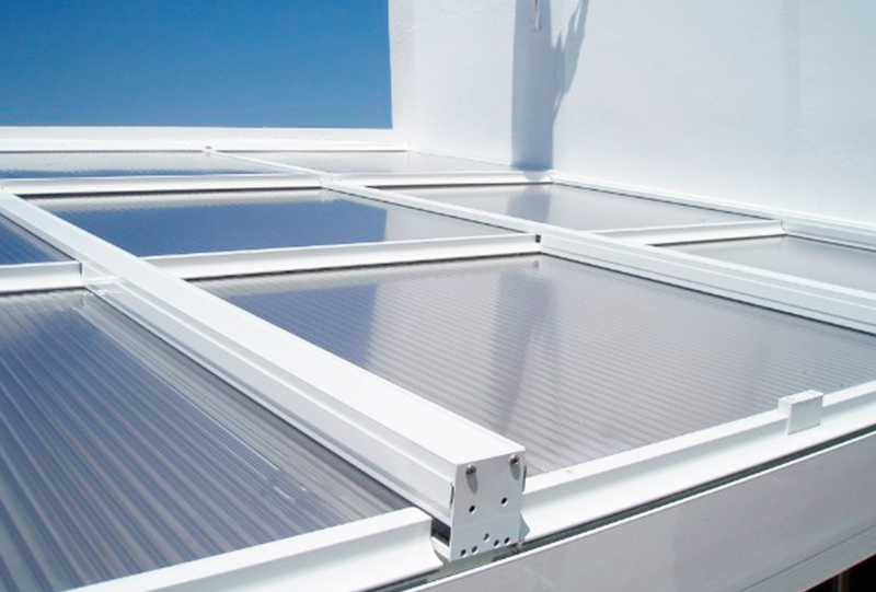 Se pueden realizar techos fijos con panel de 16mm ó autoportante de 52/84 mm. También se puede realizar techos móviles de hasta 5 hojas, adaptando el perfil suplementario de guía. Incorpora sistema de evacuación de aguas  y una vez cerrados nuestros techos son totalmente estancos  protegiendo el interior de la lluvia, y de otros elementos como el viento o la nieve. El sistema de perfiles se monta con tornillería y sujeciones ocultas sin necesidad de obras de albañilería.