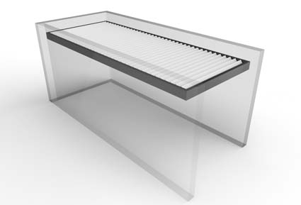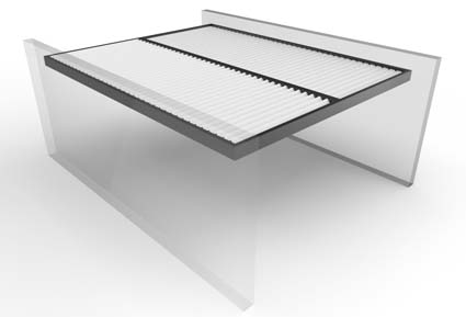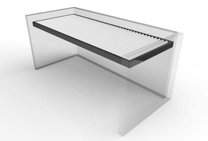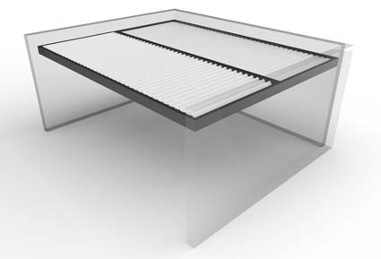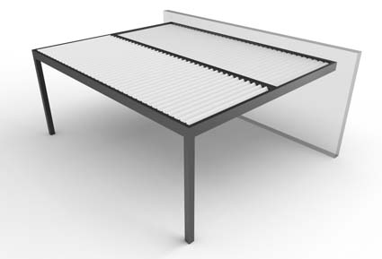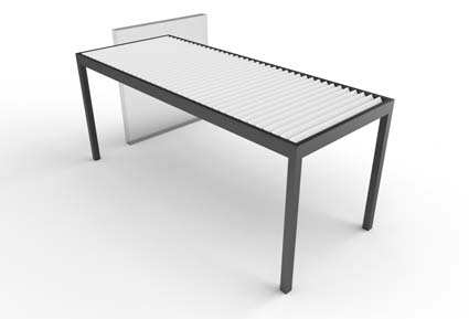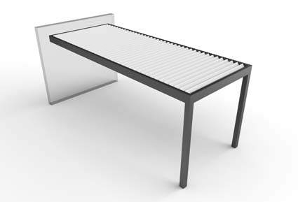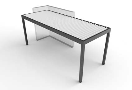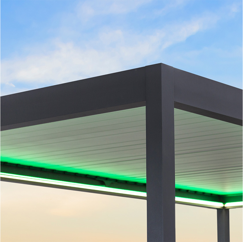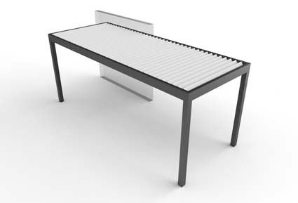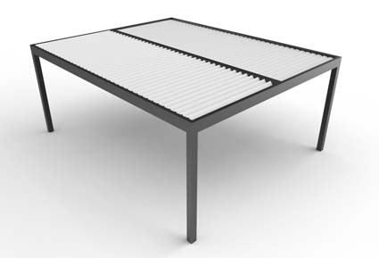 Las lamas se mueven mediante un motor oculto en el bastidor, mediante un mando controlador o desde su smartphone, con ángulos de hasta 145º, para crear el microclima ideal a cada época del año. Dispone de sensores de lluvia, viento y nieve, y la variedad de configuraciones y accesorios hacen de ella una excelente opción. Sus medidas pueden alcanzar hasta un máximo de 7 x 7 m.